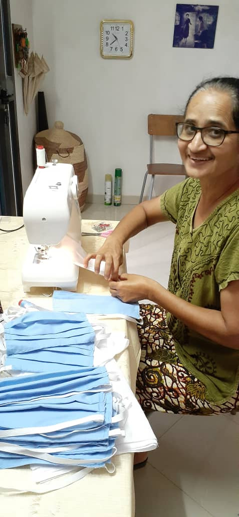 Mars 2020, après l’apparition des premiers cas de Covid-19 dans la région, des mesures de protection doivent être prises. Sr Dorothy, la responsable de la congrégation RNDM au Sénégal, en train de coudre des masques pour le personnel du dispensaire. Le dispensaire avec à l’arrière-fond le bloc WC-douches pour les patients.